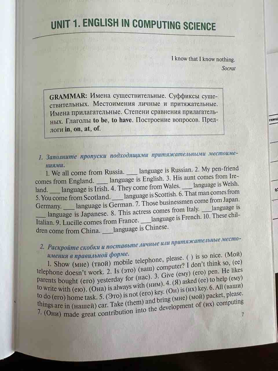 - Первое задание: Заполнить пропуски подходящими притяжательными местоимениями.