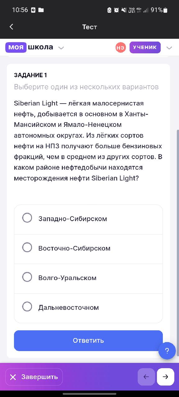 Задание гласит: "Выберите один из нескольких вариантов: Siberian Light — легкая малосернистая нефть, добывается в основном в Ханты-Мансийском и Мало-Ненецком автономных округах. Из легких сортов нефти на НПЗ получают больше бензиновых фракций, чем из других сортов. В каком районе нефтедобычи находятся месторождения нефти Siberian Light?"