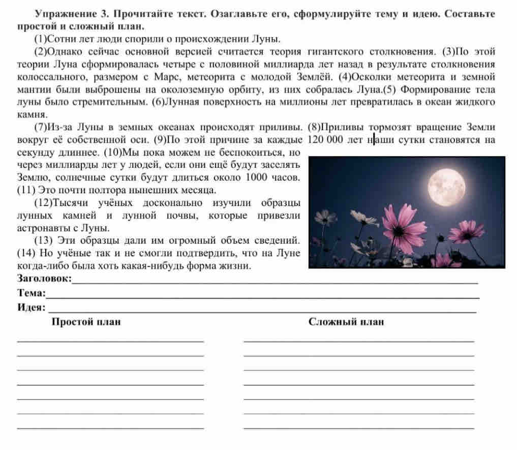 Упражнение 3. Прочитайте текст. Озаглавьте его, сформулируйте тему и идею. Составьте простой и сложный план. (1)Сотни лет люди спорили о происхождении Луны. (2) Однако сейчас основной версией считается теория гигантского столкновения. (3) По этой теории Луна сформировалась четыре с половиной миллиарда лет назад в результате столкновения колоссального, размером с Марс, метеорита с молодой Землёй. (4) Осколки метеорита и земной мантии были выброшены на околоземную орбиту, из них собралась Луна. (5) Формирование тела луны было стремительным. (6) Лунная поверхность на миллионы лет превратилась в океан жидкого камня. (7)Из-за Луны в земных океанах происходят приливы. (8) Приливы тормозят вращение Земли вокруг её собственной оси. (9) По этой причине за каждые 120 000 лет наши сутки становятся на секунду длиннее. (10)Мы пока можем не беспокоиться, но через миллиарды лет у людей, если они ещё будут заселять Землю, солнечные сутки будут длиться около 1000 часов. (11) Это почти полтора нынешних месяца. (12) Тысячи учёных досконально изучили образцы лунных камней и лунной почвы, которые привезли астронавты с Луны. (13) Эти образцы дали им огромный объем сведений. (14) Но учёные так и не смогли подтвердить, что на Луне когда-либо была хоть какая-нибудь форма жизни. Заголовок: Тема: