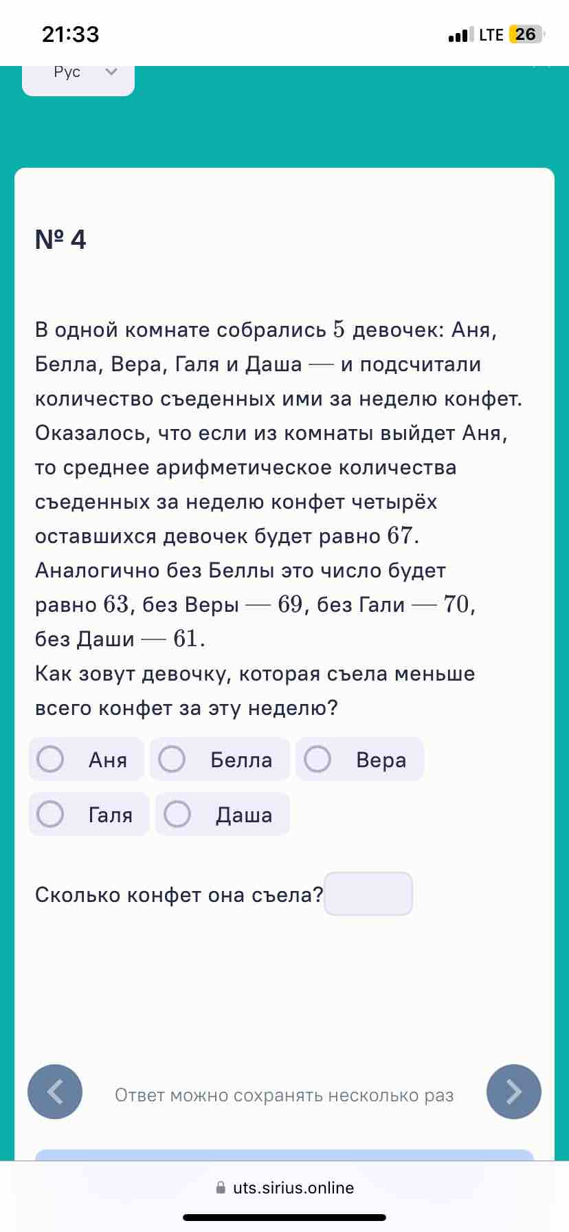Скорее всего, в тексте могли быть опечатки или ошибки. Верно будет проверить исходные данные или цифры в условии. Главное значение без учета одной девочки, которое идеально подойдет, укажет, сколько конфет съела оставшаяся. Возможно, были пересчитаны неправильно.