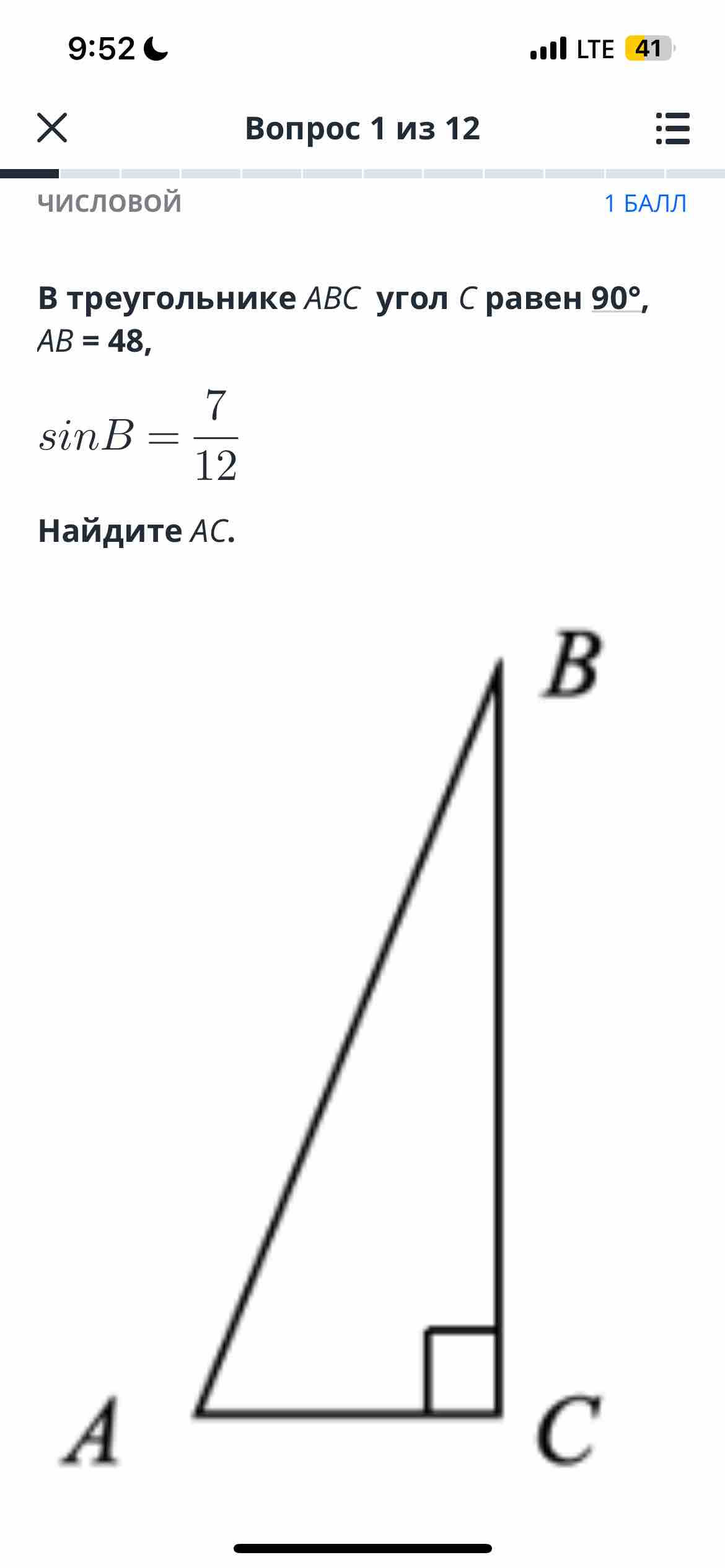 В треугольнике АВС угол С равен 90°, AB = 48, 7 sinB = 12 Найдите АС.