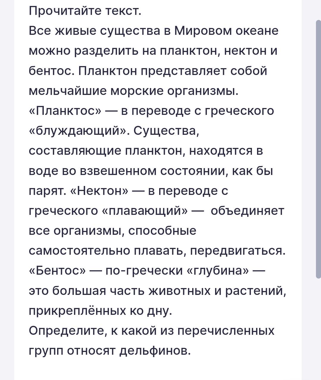Теперь давай подумаем, к какой группе относятся дельфины. Дельфины – это млекопитающие, которые активно плавают и передвигаются в воде, они не живут прикрепленными к дну и не дрейфуют как планктон. Исходя из определений в тексте, логично заключить, что дельфины относятся к нектону, так как они способны самостоятельно плавать и передвигаться в океане.
