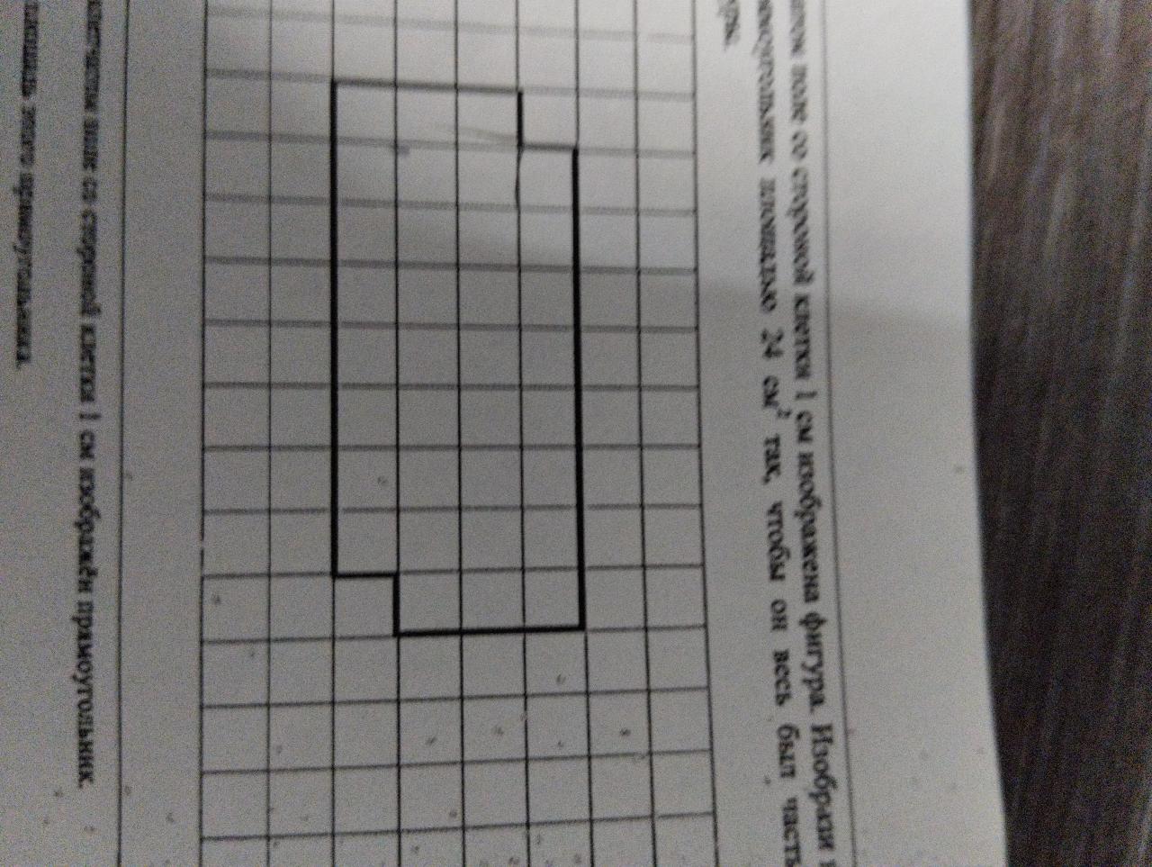 На клетчатом поле со стороной клетки 1 см изображена фигура. изобрази на рисунке прямоугольник площадью 24 кв. см, так чтобы он весь был частью данной фигуры