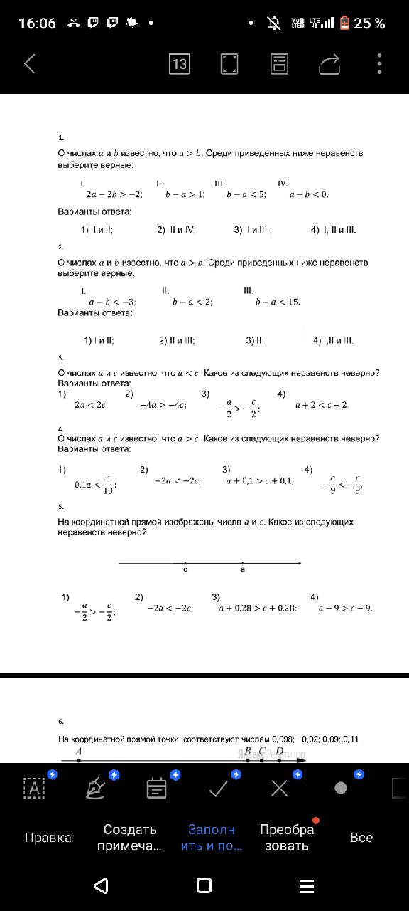 Вопрос 5. На координатной прямой отмечены числа (a), (b), и (c). Нужно определить неверное неравенство.