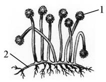 Назовите изображённый на рисунке организм и царство, к которому его относят. Что обозначено цифрами 1, 2? Какова роль этих организмов в экосистеме?