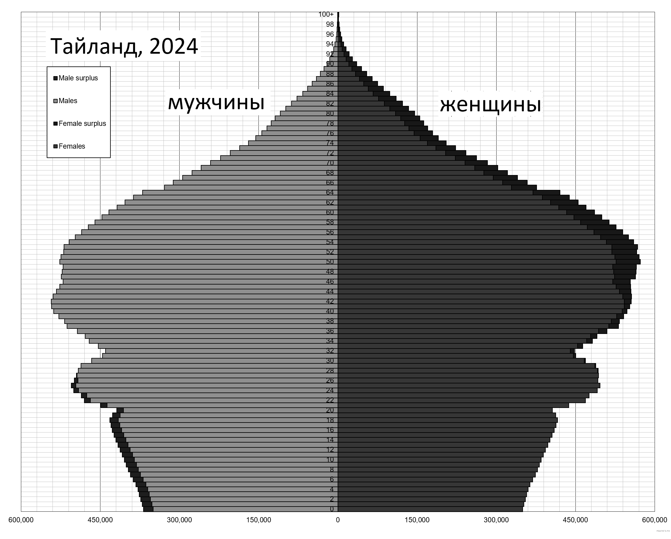 Ниже приводится половозрастная пирамида Таиланда в 2024 г.