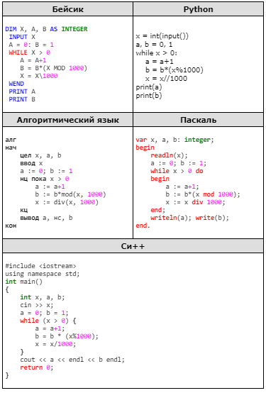 Ниже на пяти языках записан алгоритм. Получив на вход число x, этот алгоритм печатает два числа a и b. Укажите наименьшее из таких чисел x, при вводе которых алгоритм печатает сначала 2, а потом 11.