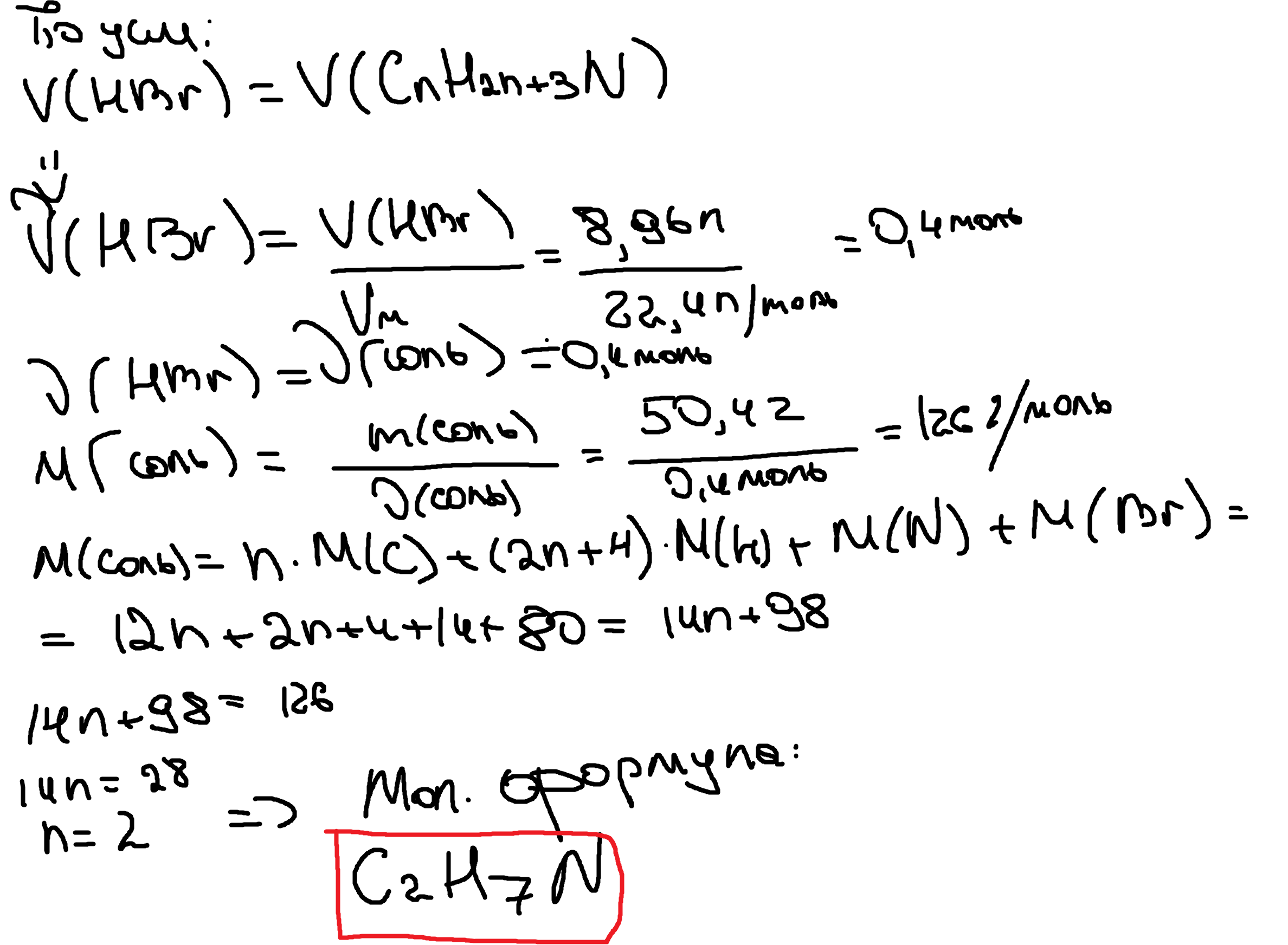 При взаимодействии 8,96 л (н.у.) бромоводорода с равным объёмом газообразного амина получен продукт массой 50,4 г. Определите молекулярную формулу амина.