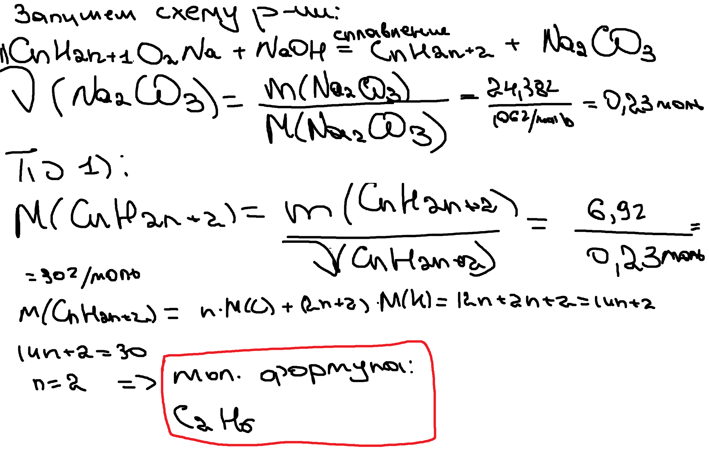 В результате сплавления натриевой соли карбоновой кислоты с гидроксидом натрия получено 24,38 г карбоната натрия и газообразное органическое вещество массой 6,9 г. Определите молекулярную формулу полученного газообразного соединения.
