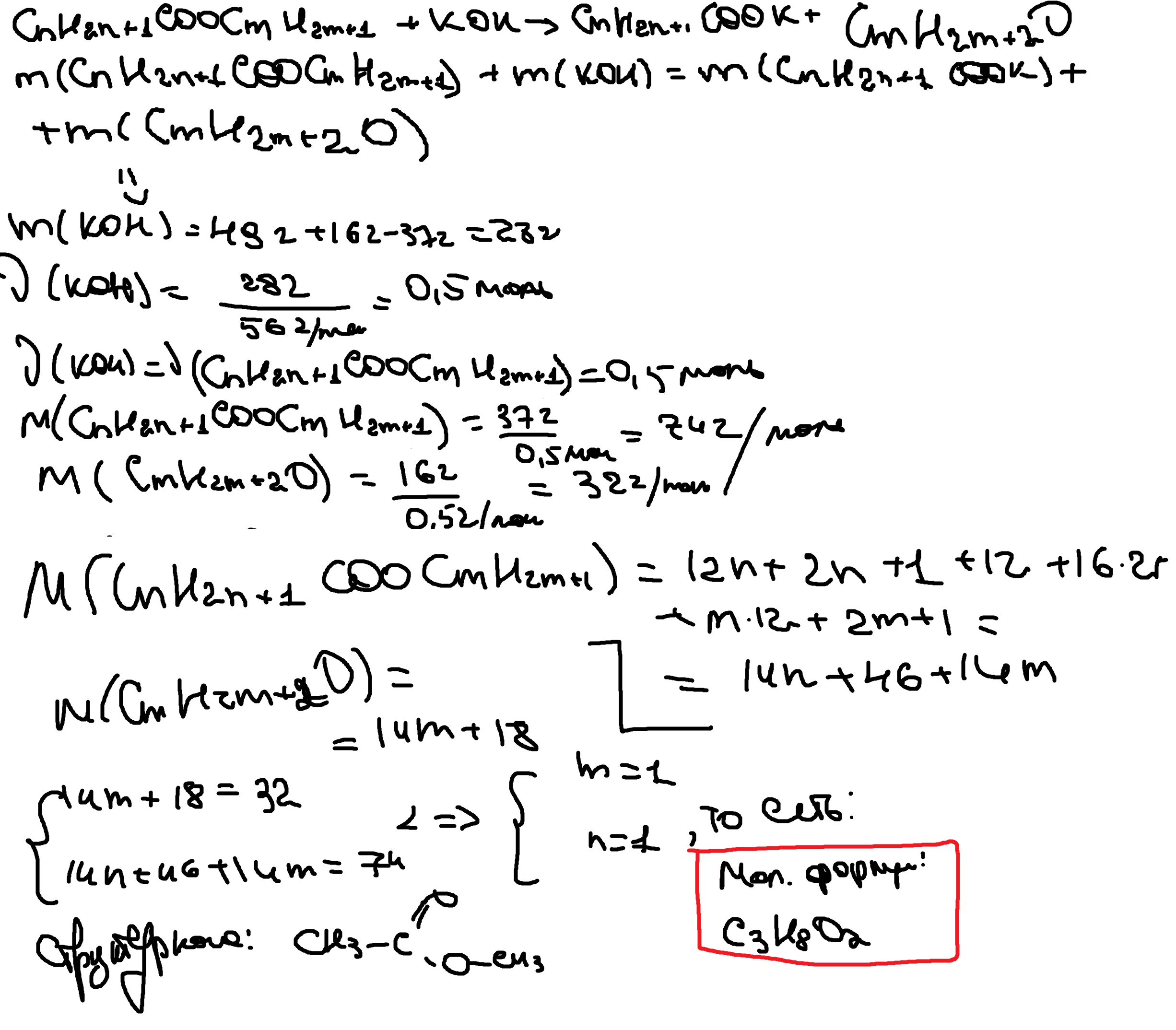 При щелочном гидролизе 37г некоторого сложного эфира получено 49г калиевой соли предельной однооснóвной кислоты и 16г спирта. Установите молекулярную формулу сложного эфира.