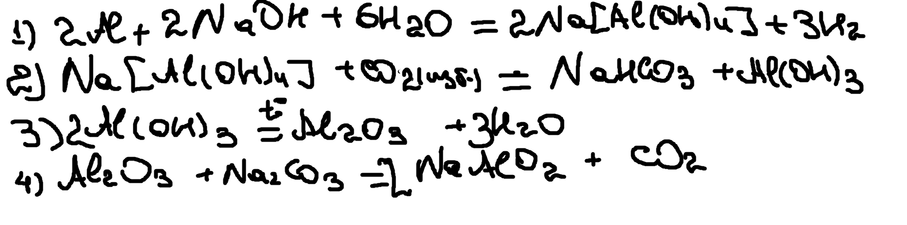 К раствору гидроксида натрия добавили порошок алюминия. Через раствор полученного вещества пропустили избыток углекислого газа. Выпавший осадок отделили и прокалили. Полученный продукт сплавили с карбонатом натрия.