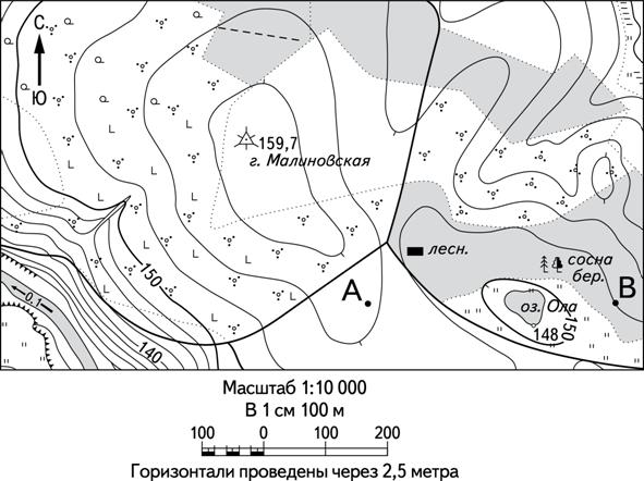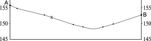 Постройте профиль рельефа местности по линии А – В. Для этого постройте основу для построения профиля на бланке ответов № 2, используя горизонтальный масштаб – в 1 см 50 м и вертикальный масштаб – в 1 см 5 м. Укажите на профиле знаком «Х» положение просёлочной дороги.