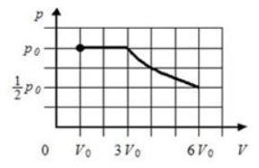 Пока в цилиндре остается вода, при медленном изотермическом расширении пар остается насыщенным. Поэтому график будет графиком константы (отрезок горизонтальной прямой). Количество воды в цилиндре при этом убывает. При комнатной температуре концентрация молекул воды в насыщенном паре очень мала по сравнению с концентрацией молекул воды в жидком агрегатном состоянии. Масса воды в два раза больше массы пара, поэтому, во-первых, в начальном состоянии насыщенный пар занимает объём, практически равный . Во-вторых, чтобы вся вода испарилась, нужно объём под поршнем увеличить ещё на . Таким образом, горизонтальный отрезок описывает зависимость на участке от до .