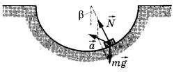 Маленькая шайба движется из состояния покоя по неподвижной гладкой сферической поверхности радиусом R. Начальное положение шайбы находится на высоте относительно нижней точки поверхности. Сделайте рисунок с указанием сил, действующих на шайбу в момент, когда она движется вправо вверх, находясь на высоте над нижней точкой поверхности (см. рисунок). Покажите на этом рисунке, куда направлено в этот момент ускорение шайбы (по радиусу поверхности, по касательной к поверхности, внутрь поверхности, наружу от поверхности). Ответ обоснуйте. Сопротивление воздуха не учитывать.