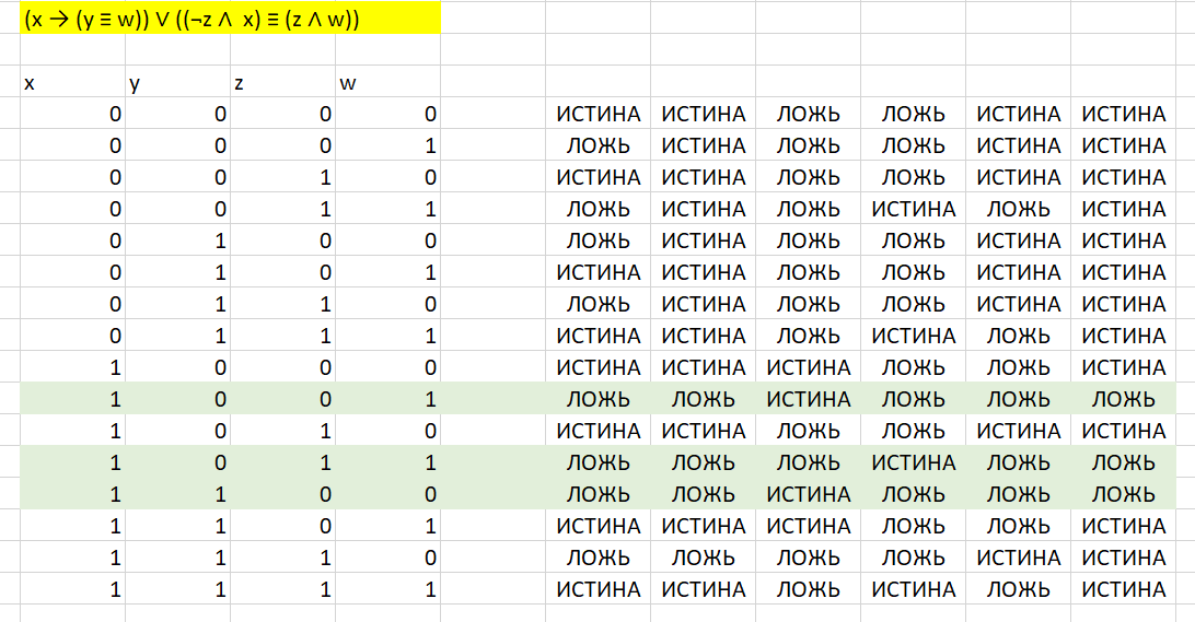 Логическая функция F задаётся выражением: (х → (y ≡ w)) ∨ ((¬z ∧ x) ≡ (z ∧ w))