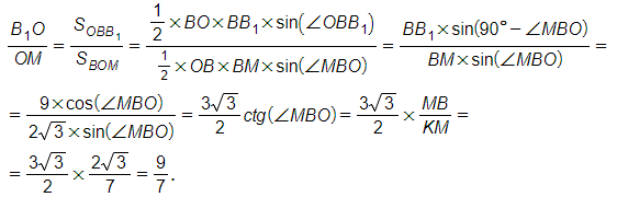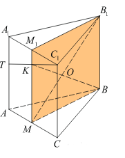 б) Обозначим середину ТС1 — K. Рассмотрим плоскость ВВ1М1М. Отрезок BK лежит в ней и в плоскости ВТС1, поэтому надо узнать, как отрезок BK делит отрезок В1М — диагональ прямоугольника ВВ1М1М со сторонами ВВ1=9, ВМ=2√3. При этом М1К=(А1Т)/2=2