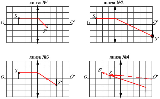 На рисунках показаны предмет S и его изображение S', полученное с помощью четырёх тонких линз. Чему равно наименьшее фокусное расстояние среди этих линз? Ответ выразите в см. Одна клетка соответствует 10 см.